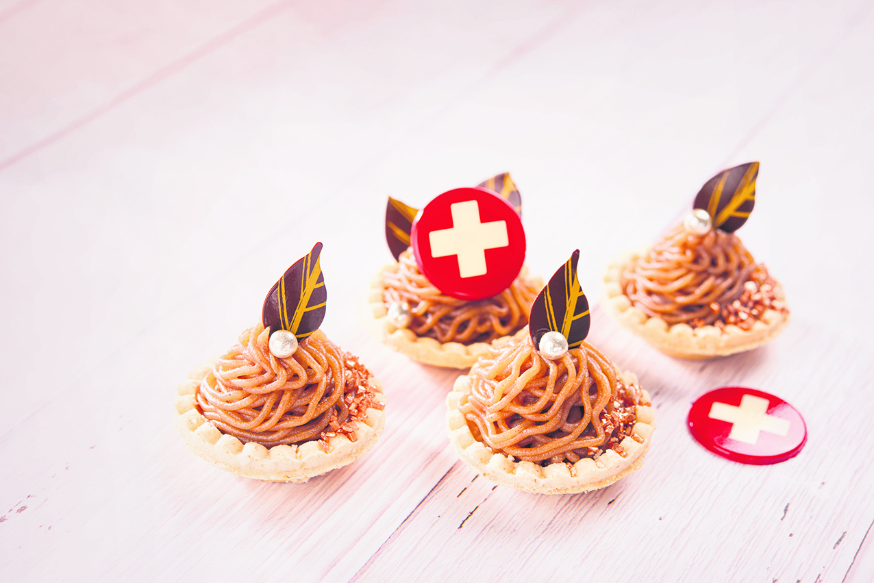 Passend zur Herbstsaison bietet der Hersteller Günthart detailgetreue Blätter aus dunkler Schokolade. Sie sind ein Hingucker auf jeder süssen Vermicelles-Kreation. Zusätzliche Akzente lassen sich mit dem Schweizer Wappen und niedlichen Pilzen aus weis-ser Schokolade setzen. Glanzperlen und bronzefarbener Glitzerzucker sorgen für edle Highlights.