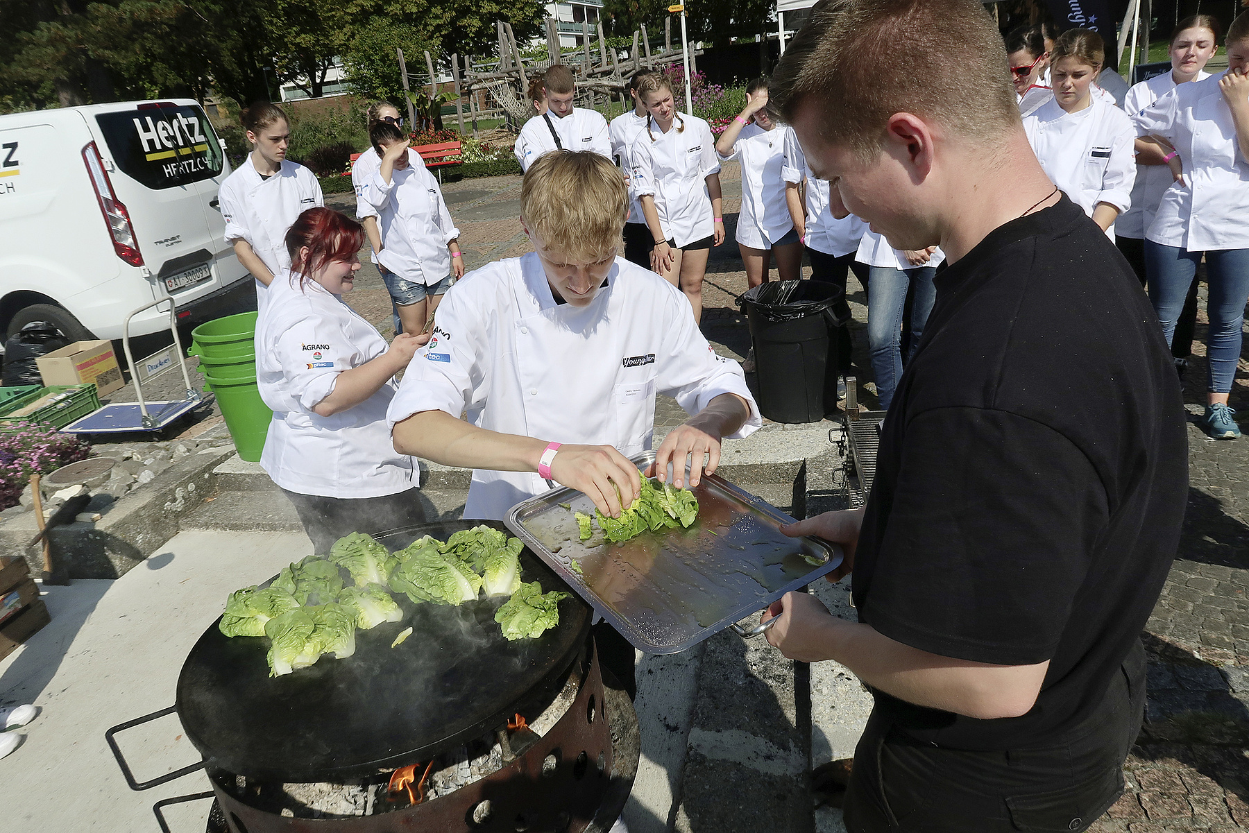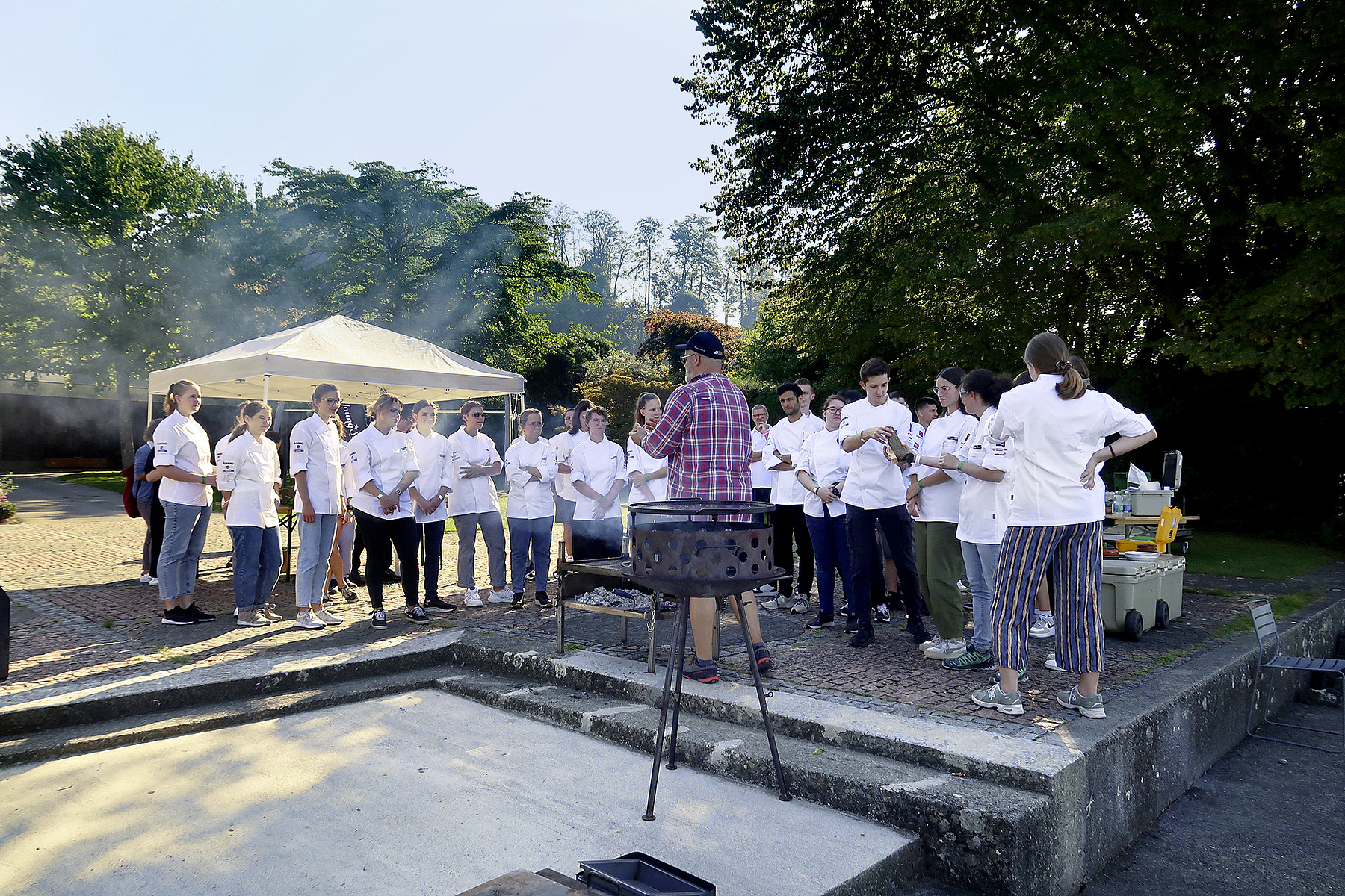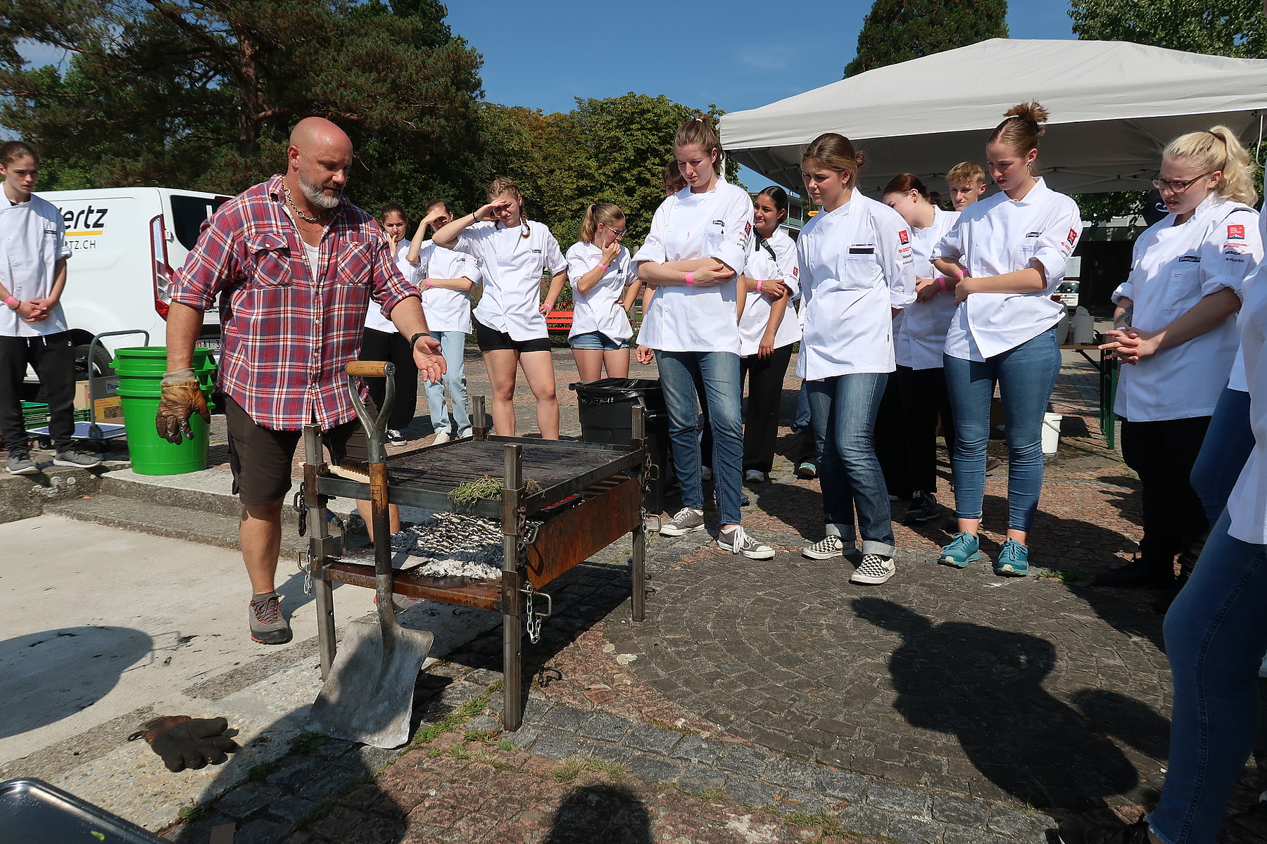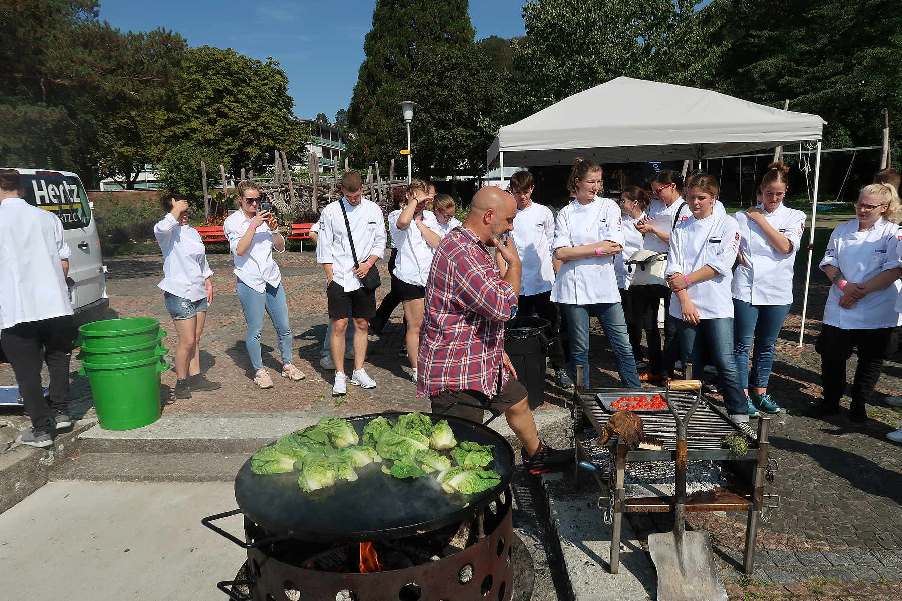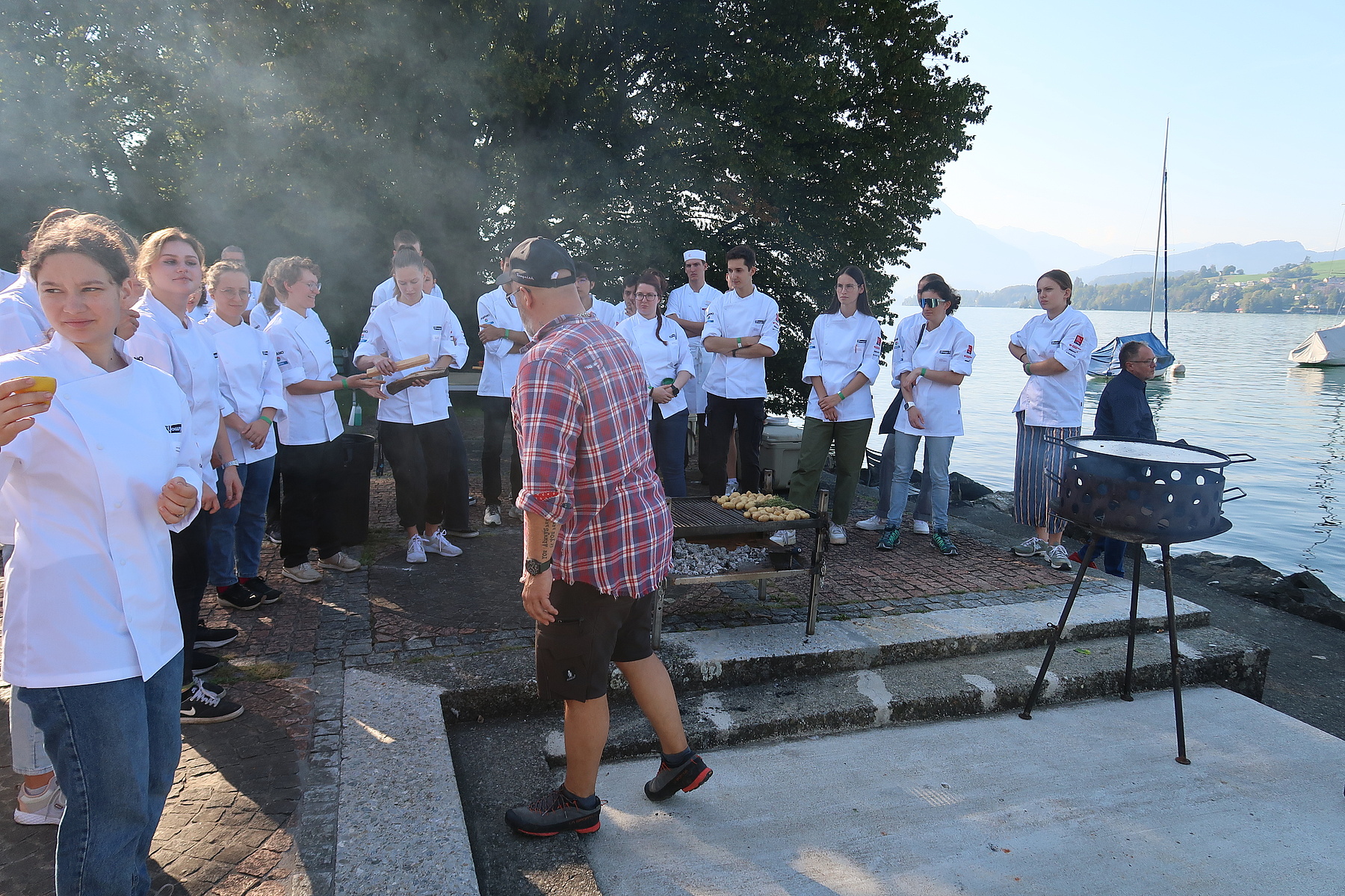 «Keep it simple» – schnelle und einfache Salate vom offenen Feuer war das Thema von René Schudel. Der Workshop des Young-Star-Fachexperten der ersten Stunde begann am Ufer des Vierwaldstättersees mit dem korrekten Aufstellen von Feuerstellen, Erklärungen zu Holzarten und der Regulierung der Temperatur. Dass Salat auf dem offenen Feuer zubereitet werden kann, überraschte die Teilnehmenden. Auch, dass die Zubereitungen so einfach sind. In der Praxis zeigte Gastrounternehmer René Schudel seine Salatfavoriten. Karamellisierte Tomaten mit Ziegenkäsesauce und Kartoffelsalat an Miso-Dressing boten eine Geschmacksexplosion. Besonders beeindruckt waren die Jungen von der süss-sauren Sauce beim grillierten Baby-Lattich-Salat.