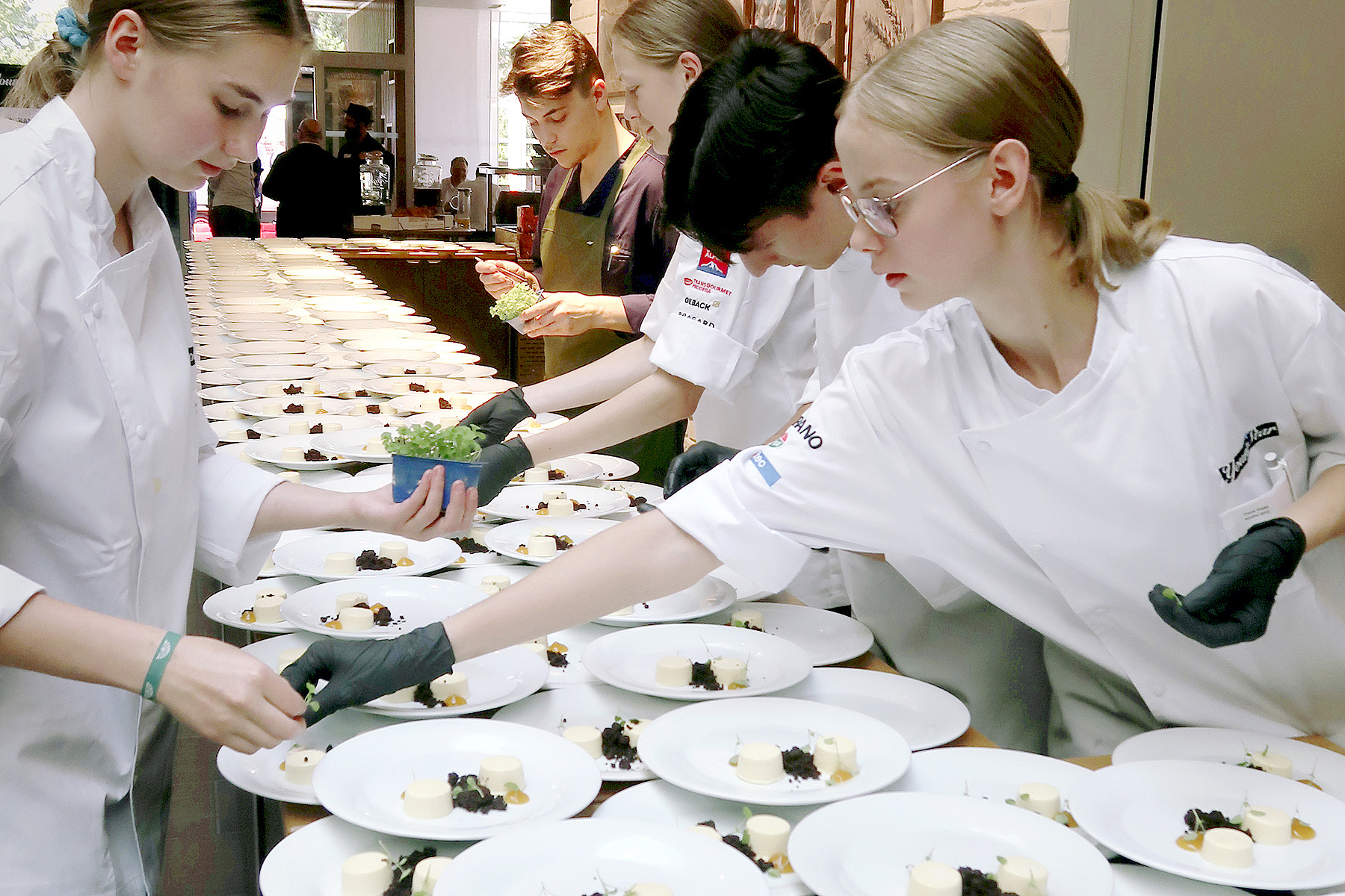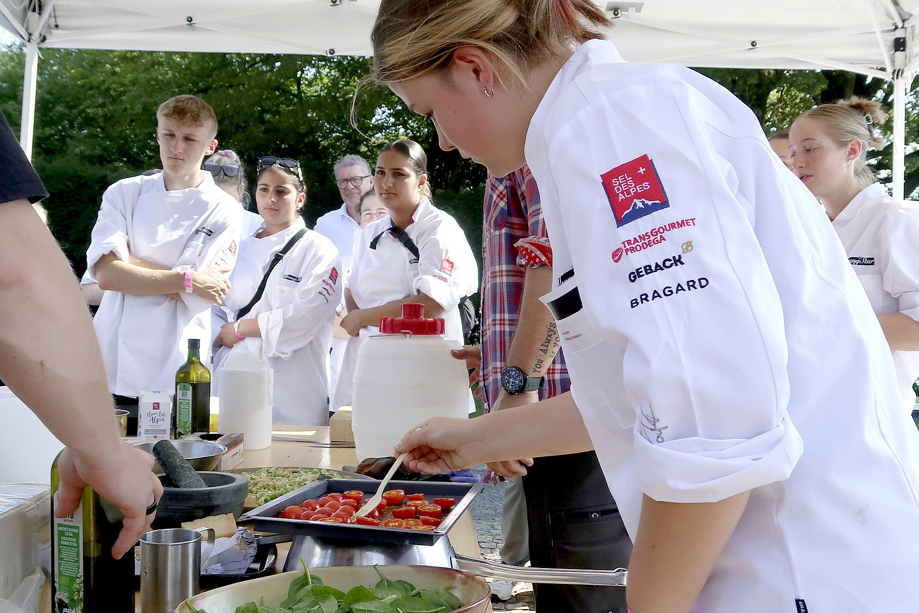 Eine Erfolgsgeschichte lieferte Juliana Thöny. Die Konditorin-Confiseurin wurde für die Swiss Skills nominiert und siegte. Nach Praktika in England und den USA gewann sie zwei Jahre später auch bei den World Skills. Das brachte ihr reichlich Medienpräsenz. Zündende Ideen hatte Linda Hüsser vom Restaurant Zur Goldige Guttere in Zürich. Deren Umsetzung fiel auf, und seither ist auch sie regelmässig in den Medien. In den vergangenen 14 Jahren schaffte es Mario Garcia bei renommierten Kochwettbewerben ins Finale und wurde zum Medienstar. 15 hoch motivierte Lernende und frisch Ausgelernte kochten gemeinsam mit ihm für die rund 200 Gäste ein Gourmetmenü. Die bunt zusammengewürfelte Kochbrigade lieferte ohne Probelauf eine hervorragende Teamleistung ab: Das Mittagessen begeisterte alle.