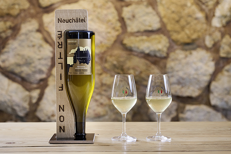 Wenn Servicefachleute die Weinflasche schütteln und diese dem Gast mit dem Hals nach unten präsentieren, sorgt das für Gesprächsstoff. Um dies zu fördern, haben Neuenburger Winzerinnen und Winzer die Etiketten zum zweiten Mal verkehrtherum auf die Flaschen geklebt. Das Schütteln wirbelt die Feinhefen auf, so dass der junge Chasselas-Wein je nach Produzent von leicht bis milchig trüb ins Glas fliesst.