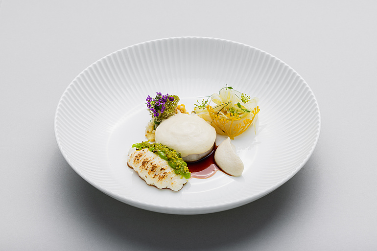 Im Arven-Sud gedämpftes Zanderfilet mit Rauchfischschaum und Fischjus